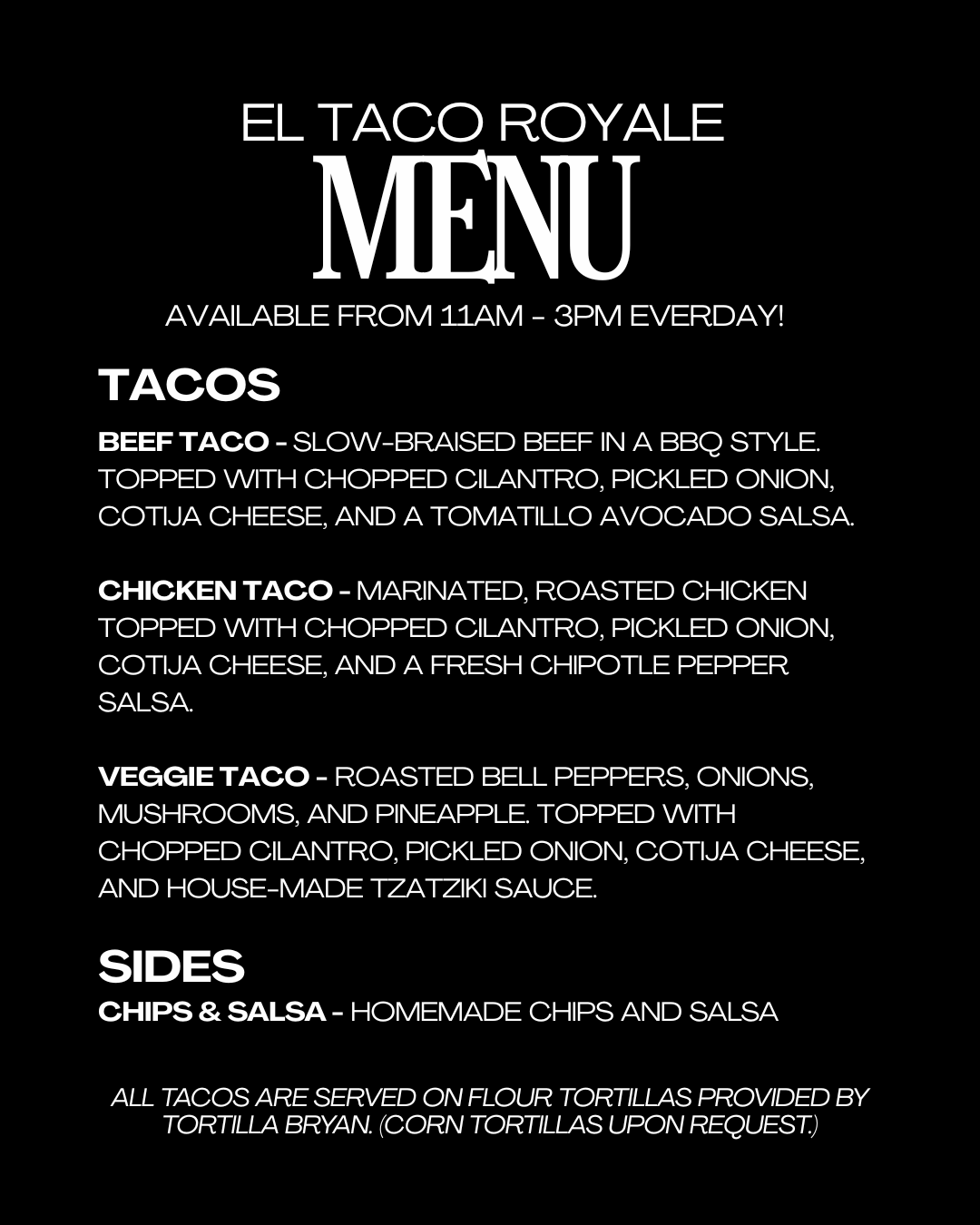 Now open! El Taco Royale at The Royal Room. Your new go-to for tacos, lunch specials, and craveable sides, all made with fresh ingredients and locally made tortillas.